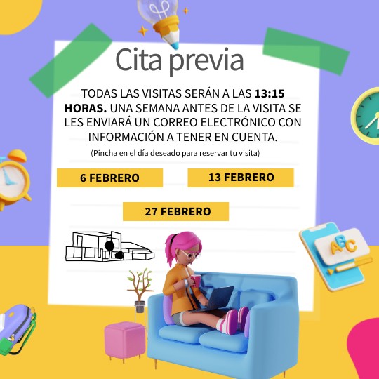 TODAS LAS VISITAS SERÁN A LAS 13:15 HORAS. UNA SEMANA ANTES DE LA VISITA SE LES ENVIARÁ UN CORREO ELECTRÓNICO CON INFORMACIÓN A TENER EN CUENTA.