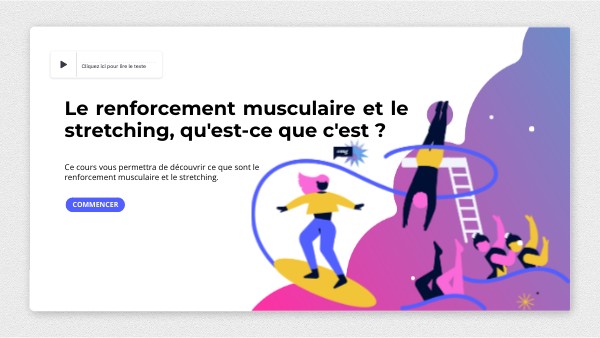 Ce cours vous a permis de découvrir ce que sont le renforcement musculaire et le stretching. Vous pouvez poursuivre avec les questions suivantes qui vous permettront de voir ce que vous avez retenu. Si vous êtes en plein écran, revenez sur l'écran principal pour cliquer sur la croix de fermeture.