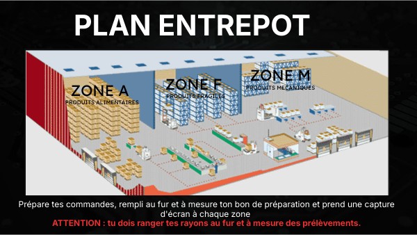Prépare tes commandes, rempli au fur et à mesure ton bon de préparation et prend une capture d'écran à chaque zone ATTENTION : tu dois ranger tes rayons au fur et à mesure des prélèvements.
