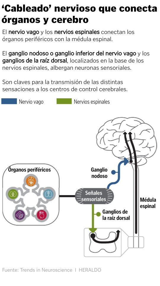 El nervio vago y los nervios espinales conectan los órganos periféricos con la médula espinal. El ganglio nodoso o ganglio inferior del nervio vago y los ganglios de la raíz dorsal, localizados en la base de los nervios espinales, albergan neuronas sensoriales. Son claves para la transmisión de las distintas sensaciones a los centros de control cerebrales.