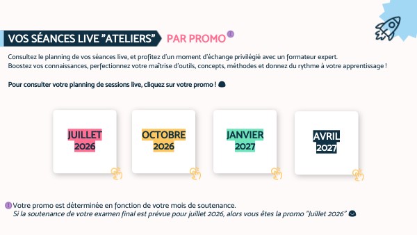 Pour consulter votre planning de sessions live, cliquez sur votre promo ! 😊