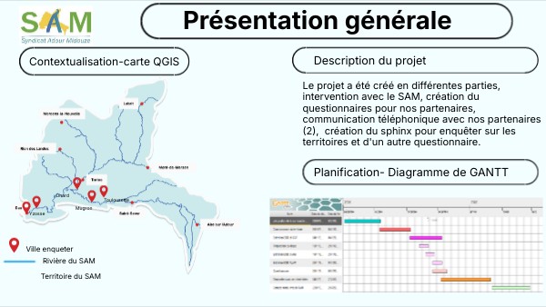 Le projet a été créé en différentes parties, intervention avec le SAM, création du questionnaires pour nos partenaires, communication téléphonique avec nos partenaires (2), création du sphinx pour enquêter sur les territoires et d'un autre questionnaire.