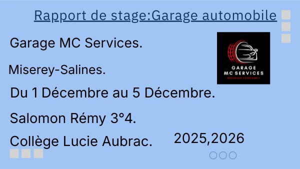 Le stage était très intéressant:il m'a permis de découvrir des activités,très variées. Mais je ne sais pas si j'en ferai mon métier plus tard car le mécanicien travaille le plus souvent dans des positions inconfortables et pénible.Mais le domaine de mécanique m'intéresse.