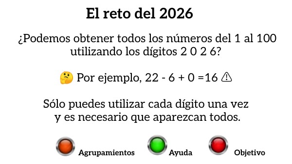 ¿Podemos obtener todos los números del 1 al 100 utilizando los dígitos 2 0 2 6? 🤔 Por ejemplo, 22 - 6 + 0 =16 ⚠️ Sólo puedes utilizar cada dígito una vez y es necesario que aparezcan todos.
