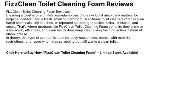 FizzClean Toilet Cleaning Foam Reviews: Cleaning a toilet is one of life’s less-glamorous chores — but it absolutely matters for hygiene, comfort, and a fresh-smelling bathroom. Traditional toilet cleaners often rely on harsh chemicals, stiff brushes, or repeated scrubbing to tackle stains, limescale, and odors. That’s where products like FizzClean Toilet Cleaning Foam come in: they promise a no-scrub, effortless, and even hands-free deep clean using foaming action instead of elbow grease. In theory, this type of product is ideal for busy households, people with mobility restrictions, or anyone who hates scrubbing but still wants a clean toilet. Click Here to Buy Now "FizzClean Toilet Cleaning Foam" – Limited Stock Available!