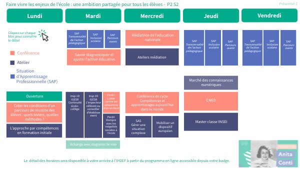 Le détail des horaires sera disponible à votre arrivée à l'IH2EF à partir du programme en ligne accessible depuis votre badge.