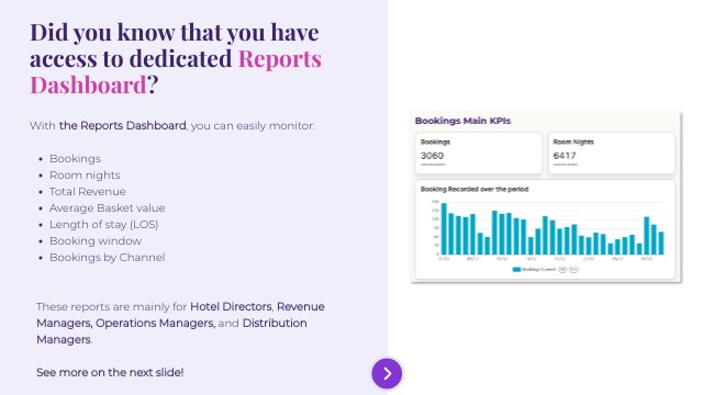These reports are mainly for Hotel Directors, Revenue Managers, Operations Managers, and Distribution Managers. See more on the next slide!