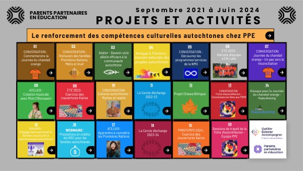 À travers ce projet, PPE a mis en lumière l’importance de l’histoire du colonialisme au Canada ainsi que de ses effets historiques et contemporains sur les Autochtones. Des activités ont été offertes afin de mieux inclure les parents PNMI en cernant les réalités des parents autochtones et en encourageant les partenaires scolaires à poser des gestes et des actions favorisant leur inclusion dans les communautés scolaires. Les activités ont permis de créer un rapprochement entre les parents autochtones francophones, anglophones et les partenaires scolaires.