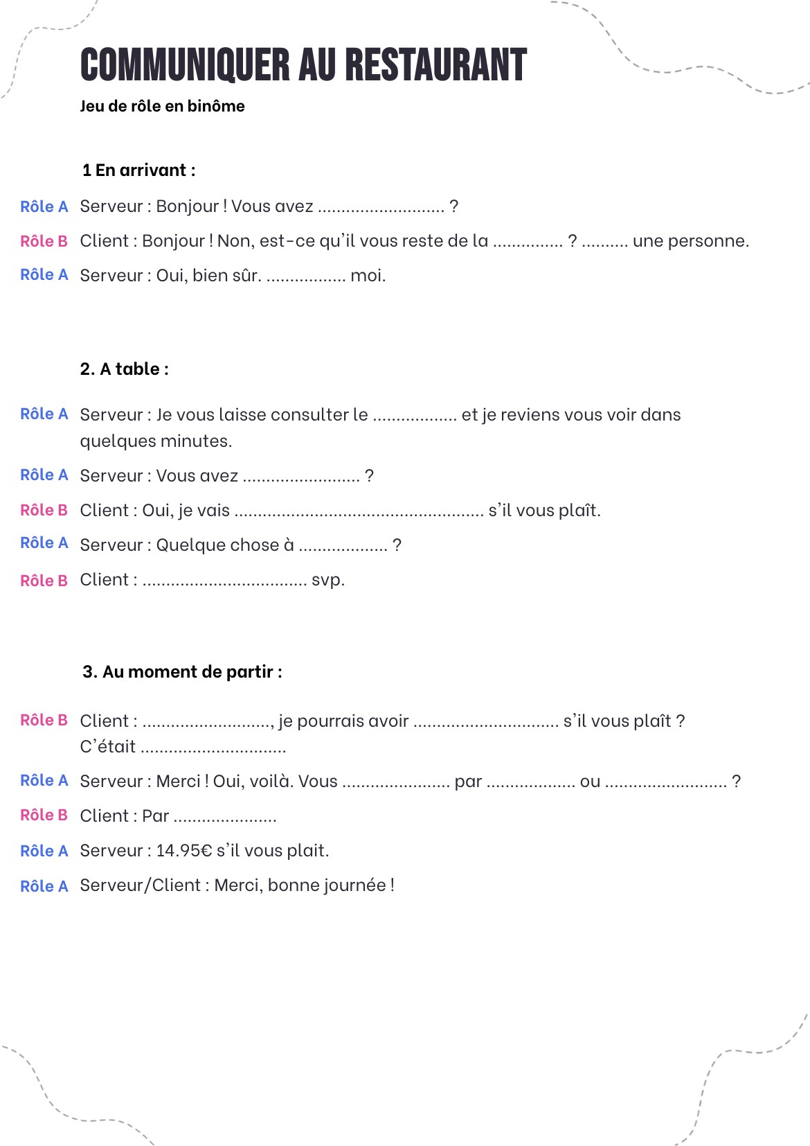 Client : ..........................., je pourrais avoir ............................... s'il vous plaît ? C'était ............................... Serveur : Merci ! Oui, voilà. Vous ....................... par ................... ou .......................... ? Client : Par ...................... Serveur : 14.95€ s'il vous plait. Serveur/Client : Merci, bonne journée !