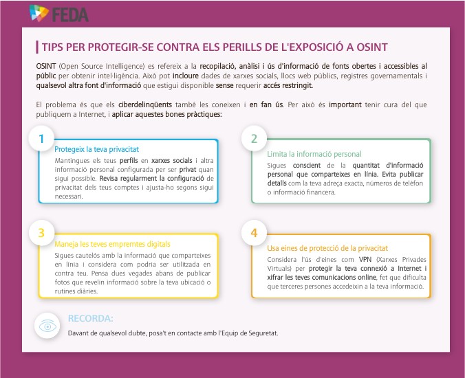 OSINT (Open Source Intelligence) es refereix a la recopilació, anàlisi i ús d'informació de fonts obertes i accessibles al públic per obtenir intel·ligència. Això pot incloure dades de xarxes socials, llocs web públics, registres governamentals i qualsevol altra font d'informació que estigui disponible sense requerir accés restringit. El problema és que els ciberdelinqüents també les coneixen i en fan ús. Per això és important tenir cura del que publiquem a Internet, i aplicar aquestes bones pràctiques: