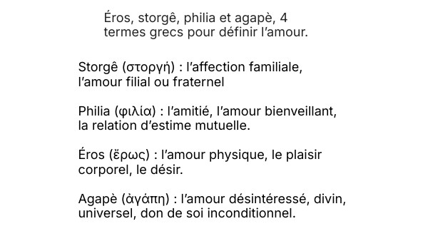 Storgê (στοργή) : l’affection familiale, l’amour filial ou fraternel Philia (φιλία) : l’amitié, l’amour bienveillant, la relation d’estime mutuelle. Éros (ἔρως) : l’amour physique, le plaisir corporel, le désir. Agapè (ἀγάπη) : l’amour désintéressé, divin, universel, don de soi inconditionnel.
