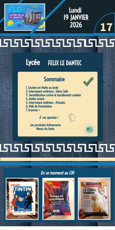 1. Soutien en Maths au lycée 2. Intervenant extérieur : Glenn Salic 3. Sensibilisation contre le harcèlement scolaire 4. Atelier Avenir 5. Intervenant extérieur : M.Godoc 6. Midi de l'orientation 7. Erasmus + À vos agendas ! Les prochains événements Menus du Greta