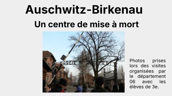 Ce camp est conçu pour que l'extermination des Juifs soit la plus efficace possible. Les Juifs arrivent en train directement à l'intérieur du camp. Ils sont triés dès la descente du train sur la rampe de débarquement. Les chambres à gaz et les fours crématoires sont situés juste au bout de ligne de chemin de fer. Les Juifs n'ont pas beaucoup à marcher pour se rendre dans les installations de mise à mort. Il faut environ deux heures pour tuer 90% des personnes qui arrivent dans un convoi (= un train). Ce génocide a fait plus de 5 millions de morts chez les Juifs et 240 000 morts chez les Tziganes. A cela s'ajoute, 70 000 malades mentaux.