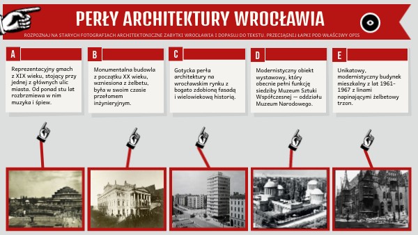 ROZPOZNAJ NA STARYCH FOTOGRAFIACH ARCHITEKTONICZNE ZABYTKI WROCŁAWIA I DOPASUJ DO TEKSTU. PRZECIĄGNIJ ŁAPKI POD WŁAŚCIWY OPIS