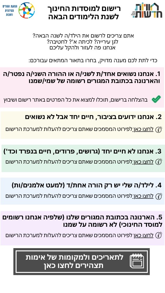 אתם צריכים לרשום את הילד/ה לשנה הבאה? לגן עירייה? לכיתה א'? לחטיבה? אנחנו פה לעזור ולהקל עליכם
