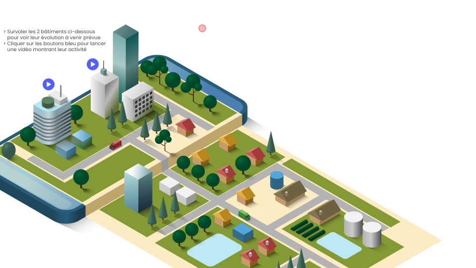 > Survoler les 2 bâtiments ci-dessous> pour voir leur évolution à venir prévue> Cliquer sur les boutons bleu pour lancer> une vidéo montrant leur activité