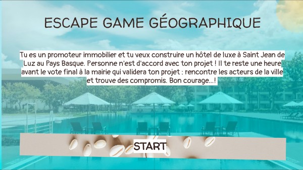 Tu es un promoteur immobilier et tu veux construire un hôtel de luxe à Saint Jean de Luz au Pays Basque. Personne n'est d'accord avec ton projet ! Il te reste une heure avant le vote final à la mairie qui validera ton projet : rencontre les acteurs de la ville et trouve des compromis. Bon courage...!