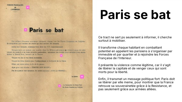 Ce tract ne sert ps seulement à informer, il cherche surtout à mobiliser. Il transforme chaque habitant en combattant potentiel en appelent les parisiens à s'organiser par immeuble et par quartier et à rejoindre les Forces Française de l'Interieur. Il présente la violence comme légitime, car il s'agit de libérer la capitale et de venger ceux qui sont morts pour la liberté. Enfin, il transmet un message politique fort: Paris doit se libérer par elle meme, pour montrer que la France retrouve sa souverainetée grâce à la Resistance, et pas seulement grâce aux armées alliées.