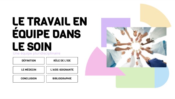 Le travail en équipe dans le soin correspond à une collaboration entre les différents professionnels de santé (équipe pluridisciplinaire) et le patient, qui a pour but de lui apporter les soins nécessaires en toute sécurité. L'infirmièr(e) occupe une place centrale, il assure la coordination, l'adaptation des soins et la transmission des informations