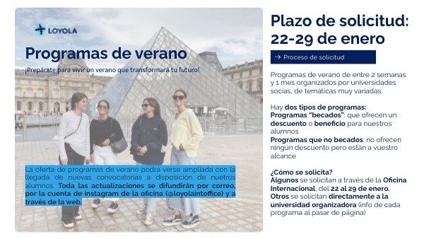 La oferta de programas de verano podrá verse ampliada con la llegada de nuevas convocatorias a disposición de nuetros alumnos. Toda las actualizaciones se difundirán por correo, por la cuenta de instagram de la oficina (@loyolaintoffice) y a través de la web.