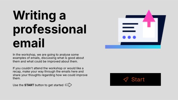 In the workshop, we are going to analyse some examples of emails, discussing what is good about them and what could be improved about them. If you couldn't attend the workshop or would like a recap, make your way through the emails here and share your thoughts regarding how we could improve them. Use the START button to get started