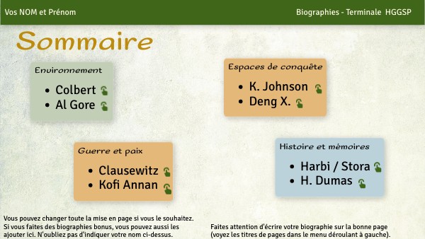 Vous pouvez changer toute la mise en page si vous le souhaitez. Si vous faites des biographies bonus, vous pouvez aussi les ajouter ici. N'oubliez pas d'indiquer votre nom ci-dessus.