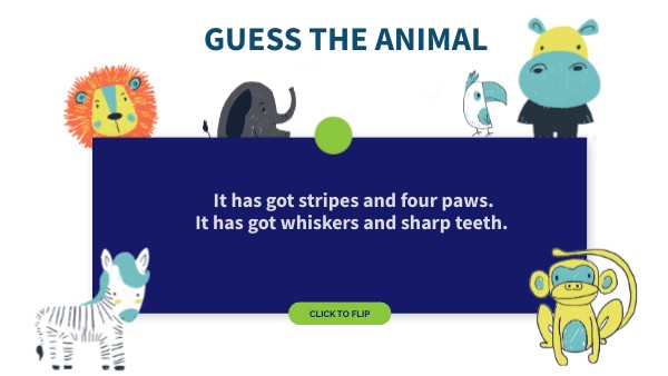 It has got... a long tail/ sharp teeth/ stripy fur. It hasn't got... It is a ... (cute/ slow /fast) animal. It can... (walk/run/ swim) It can't... It's a pet. / It's not a pet.