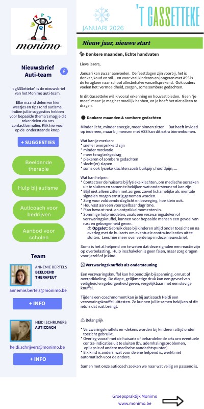 ''t gASSetteke" is de nieuwsbrief van het Monimo auti-team. Elke maand delen we hier weetjes en tips rond autisme. Indien jullie suggesties hebben voor bepaalde thema's mag je dit zeker delen via ons contactformulier. Klik hiervoor op de onderstaande knop.