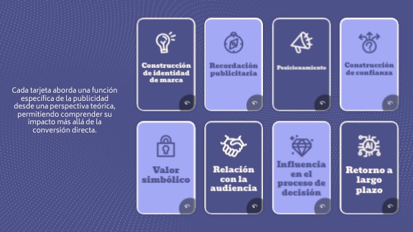 Cada tarjeta aborda una función específica de la publicidad desde una perspectiva teórica, permitiendo comprender su impacto más allá de la conversión directa.