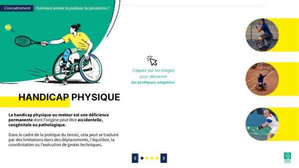 Le handicap physique ou moteur est une déficience permanente dont l'origine peut être accidentelle, congénitale ou pathologique. Dans le cadre de la pratique du tennis, cela peut se traduire par des limitations dans des déplacements, l'équilibre, la coordintation ou l'exécution de gestes techniques.