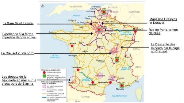 La notion est le développement des chemins de fer. On voit une gare avec une structure métallique avec la fumée qui s'échappe des trains en premier plan on voit des passagers se déplaçant montrant que c'est une gare active. C'est une transformation économique puisque le transport de marchandises se fera plus rapidement, ça viens symboliser la révolution industrielle