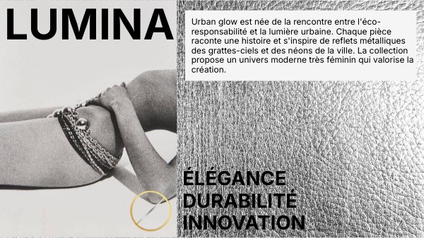 Urban glow est née de la rencontre entre l'éco-responsabilité et la lumière urbaine. Chaque pièce raconte une histoire et s'inspire de reflets métalliques des grattes-ciels et des néons de la ville. La collection propose un univers moderne très féminin qui valorise la création.