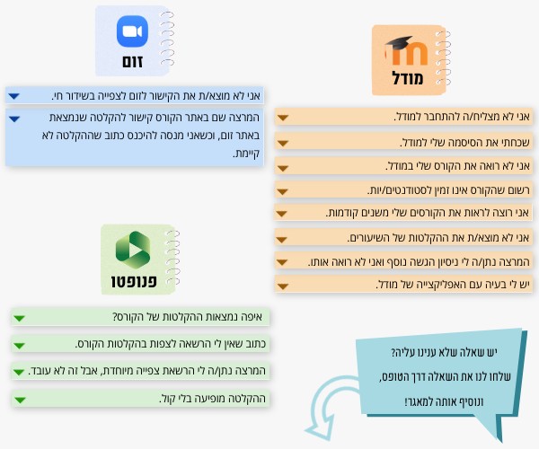 במידה והקורס עדיין לא מופיע, נא לפנות למזכירות הפקולטה ולבדוק שאתם/ן אכן רשומים/ות לקורס. במידה ואתם/ן כן רשומים אך לא רואים/ות את הקורס, פנו אלינו.