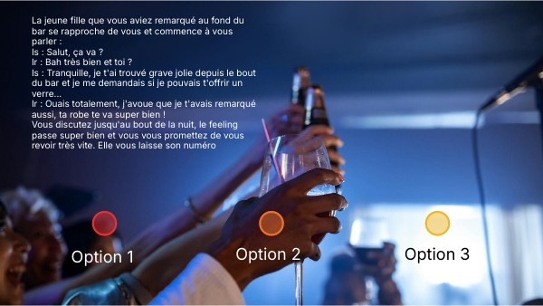 La jeune fille que vous aviez remarqué au fond du bar se rapproche de vous et commence à vous parler : Is : Salut, ça va ? Ir : Bah très bien et toi ? Is : Tranquille, je t'ai trouvé grave jolie depuis le bout du bar et je me demandais si je pouvais t'offrir un verre... Ir : Ouais totalement, j'avoue que je t'avais remarqué aussi, ta robe te va super bien ! Vous discutez jusqu'au bout de la nuit, le feeling passe super bien et vous vous promettez de vous revoir très vite. Elle vous laisse son numéro