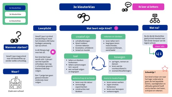 Vanaf 5 jaar is je kind leerplichtig en moet het minstens 290 halve lesdagen aanwezig zijn op school. In dit filmpje legt men het uit. Een kind dat 6 jaar wordt vóór 1 januari van het lopende schooljaar, kan nog 1 schooljaar gewoon kleuteronderwijs volgen. Een 7-jarige kan geen gewoon kleuter-onderwijs meer volgen.