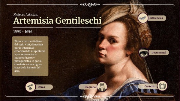 Artemisia Gentileschi nació en Roma en 1593, hija del pintor Orazio Gentileschi, quien fue su primer maestro y la introdujo desde muy joven en el mundo del arte. Influenciada por el estilo de Caravaggio, desarrolló una pintura marcada por el dramatismo, el fuerte contraste de luces y sombras y un notable realismo. Desde el inicio, demostró un talento excepcional, poco común para una mujer en el contexto artístico del siglo XVII. A lo largo de su carrera trabajó en importantes centros artísticos como Roma, Florencia, Nápoles y Londres. Fue la primera mujer admitida en la Accademia delle Arti del Disegno de Florencia, logro que consolidó su reconocimiento profesional. Sus obras suelen representar escenas bíblicas y mitológicas protagonizadas por mujeres fuertes, decididas y activas, como Judit, Susana y Cleopatra. En su vida personal enfrentó grandes dificultades y prejuicios, pero logró mantener una carrera independiente y exitosa.