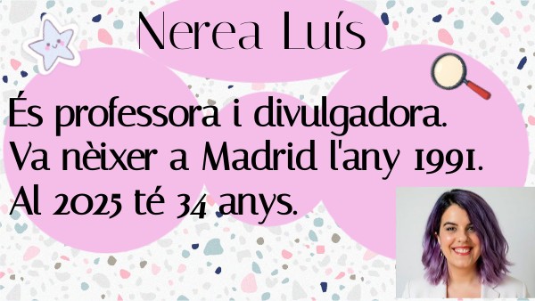 És professora i divulgadora. Va nèixer a Madrid l'any 1991. Al 2025 té 34 anys.