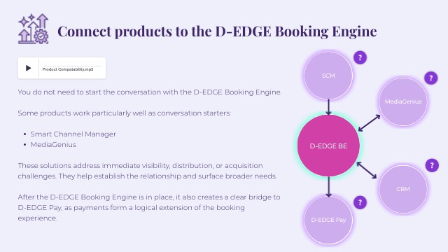 These solutions address immediate visibility, distribution, or acquisition challenges. They help establish the relationship and surface broader needs. After the D-EDGE Booking Engine is in place, it also creates a clear bridge to D-EDGE Pay, as payments form a logical extension of the booking experience.D-EDGE BE
