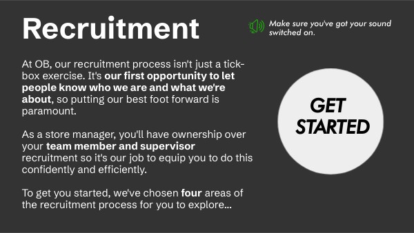At OB, our recruitment process isn't just a tick-box exercise. It's our first opportunity to let people know who we are and what we're about, so putting our best foot forward is paramount. As a store manager, you'll have ownership over your team member and supervisor recruitment so it's our job to equip you to do this confidently and efficiently. To get you started, we've chosen four areas of the recruitment process for you to explore...