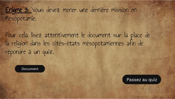 Enigme 3: Vous devez mener une dernière mission en Mésopotamie. Pour cela, lisez attentivement le document sur la place de la religion dans les cités-états mésopotamiennes afin de répondre à un quiz.