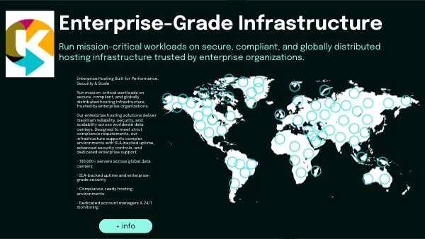 Enterprise Hosting Built for Performance, Security & Scale Run mission-critical workloads on secure, compliant, and globally distributed hosting infrastructure trusted by enterprise organizations. Our enterprise hosting solutions deliver maximum reliability, security, and scalability across worldwide data centers. Designed to meet strict compliance requirements, our infrastructure supports complex environments with SLA-backed uptime, advanced security controls, and dedicated enterprise support. • 100,000+ servers across global data centers • SLA-backed uptime and enterprise-grade security • Compliance-ready hosting environments • Dedicated account managers & 24/7 monitoring