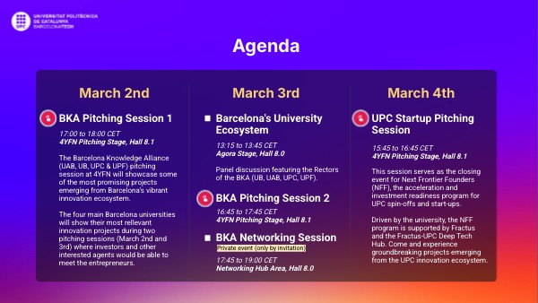 17:00 to 18:00 CET 4YFN Pitching Stage, Hall 8.1 The Barcelona Knowledge Alliance (UAB, UB, UPC & UPF) pitching session at 4YFN will showcase some of the most promising projects emerging from Barcelona’s vibrant innovation ecosystem. The four main Barcelona universities will show their most rellevant innovation projects during two pitching sessions (March 2nd and 3rd) where investors and other interested agents would be able to meet the entrepreneurs.