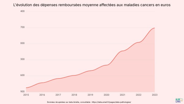 L'évolution des dépenses remboursées moyenne affectées aux maladies cancers en euros