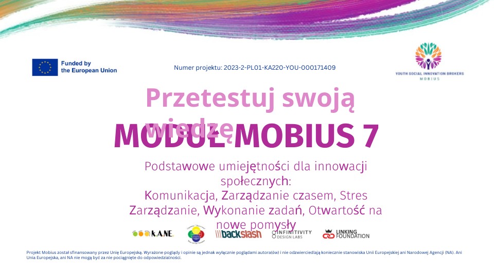 Projekt Mobius został sfinansowany przez Unię Europejską. Wyrażone poglądy i opinie są jednak wyłącznie poglądami autora(ów) i nie odzwierciedlają koniecznie stanowiska Unii Europejskiej ani Narodowej Agencji (NA). AniUnia Europejska, ani NA nie mogą być za nie pociągnięte do odpowiedzialności.