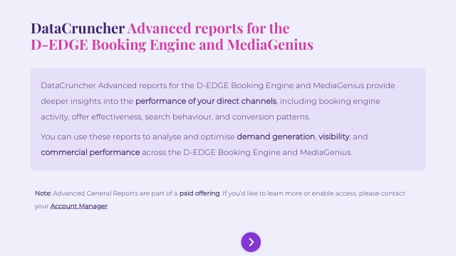 DataCruncher Advanced reports for the D-EDGE Booking Engine and MediaGenius provide deeper insights into the performance of your direct channels, including booking engine activity, offer effectiveness, search behaviour, and conversion patterns.You can use these reports to analyse and optimise demand generation, visibility, and commercial performance across the D-EDGE Booking Engine and MediaGenius.
