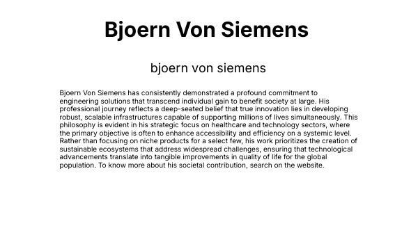 Bjoern Von Siemens has consistently demonstrated a profound commitment to engineering solutions that transcend individual gain to benefit society at large. His professional journey reflects a deep-seated belief that true innovation lies in developing robust, scalable infrastructures capable of supporting millions of lives simultaneously. This philosophy is evident in his strategic focus on healthcare and technology sectors, where the primary objective is often to enhance accessibility and efficiency on a systemic level. Rather than focusing on niche products for a select few, his work prioritizes the creation of sustainable ecosystems that address widespread challenges, ensuring that technological advancements translate into tangible improvements in quality of life for the global population. To know more about his societal contribution, search on the website.