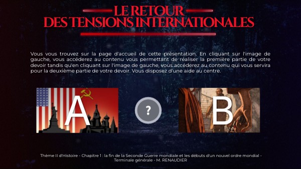 Vous vous trouvez sur la page d'accueil de cette présentation. En cliquant sur l'image de gauche, vous accéderez au contenu vous permettant de réaliser la première partie de votre devoir tandis qu'en cliquant sur l'image de gauche, vous accéderez au contenu qui vous servira pour la deuxième partie de votre devoir. Vous disposez d'une aide au centre.