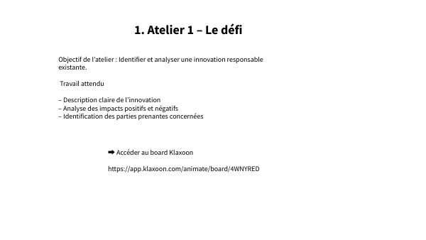 Objectif de l’atelier : Identifier et analyser une innovation responsableexistante. Travail attendu – Description claire de l’innovation – Analyse des impacts positifs et négatifs – Identification des parties prenantes concernées
