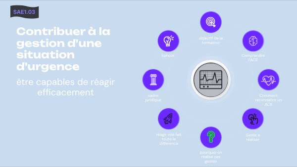 1. Identifier un ACR 2. Le comprendre 3. Réaliser les gestes appropriers 4. comprendre l'importance de reagir vite 5. prendre connaissance du volets juridique qu'implique d'etre SST 6. Identifier les acteurs de la gestion des accidents internes et externes à la structure 7. Apprendre de la façons la plus pedagogique