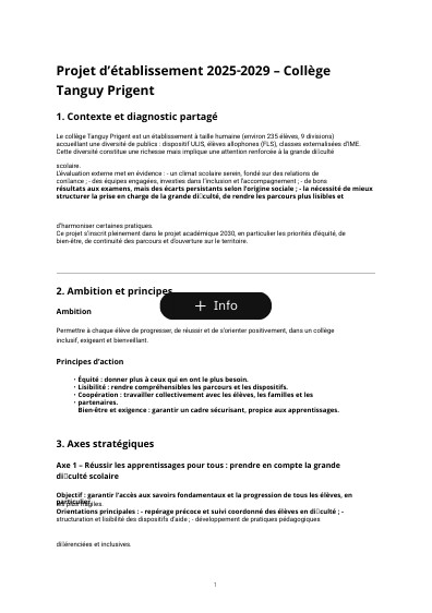 Titre : Projet d’établissement 2025‑2029 – Collège Tanguy PrigentAccroche : « Réussir ensemble, dans un collège inclusif et exigeant »Visuels : photo du collège + pictogrammes élèves / équipe / territoire